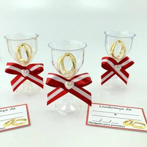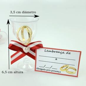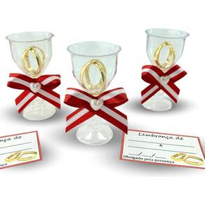 Tacinhas com aliancinhas kit com 30 unidades Lembrancinhas para casamento Lindas lembrancinhas para casamento, noivado ou bôdas. As tacinhas são decoradas com lacinho de cetim e um par de aliancinhas no interior da tacinha. São um mimo, charmosas e encantadoras, darão um toque todo especial expressando o sentimento de alegria e gratidão com seus amigos e familiares, que estiveram presentes no dia mais importante da sua vida. - Tacinhas em acrílico transparente; - Mede aproximadamente 6,5 cm de altura X 3,5 cm de diâmetro; - Decorada com lacinho de cetim, nas cores vermelho com branco; - Aliancinhas douradas no interior da tacinha dão um toque todo especial à sua lembrancinha; Os tags cartõezinhos acompanham o kit para você preencher com os nomes e data. TAGS NÃO PERSONALIZADOS do vendedor: 7 dias Marca: Não Informado
