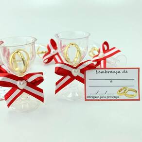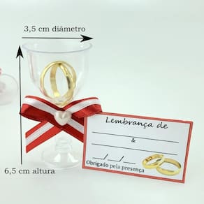 Tacinhas com aliancinhas kit com 30 unidades Lembrancinhas para casamento Lindas lembrancinhas para casamento, noivado ou bôdas. As tacinhas são decoradas com lacinho de cetim e um par de aliancinhas no interior da tacinha. São um mimo, charmosas e encantadoras, darão um toque todo especial expressando o sentimento de alegria e gratidão com seus amigos e familiares, que estiveram presentes no dia mais importante da sua vida. - Tacinhas em acrílico transparente; - Mede aproximadamente 6,5 cm de altura X 3,5 cm de diâmetro; - Decorada com lacinho de cetim, nas cores vermelho com branco; - Aliancinhas douradas no interior da tacinha dão um toque todo especial à sua lembrancinha; Os tags cartõezinhos acompanham o kit para você preencher com os nomes e data. TAGS NÃO PERSONALIZADOS do vendedor: 7 dias Marca: Não Informado