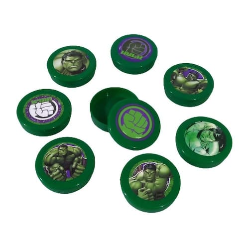 Contém: 10 Mini Latinha Hulk para Lembrancinha com Adesivo