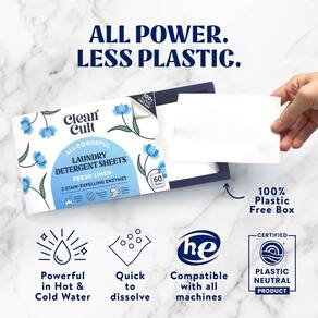 Cleancult Folhas de detergente para roupas – caixa resselável – 3 enzimas que combatem manchas – linho fresco – 60 cargas – livre de produtos químicos agressivos – sem bagunça – sem resíduos de
