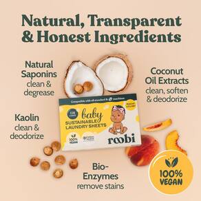 A solução de lavanderia perfeita que mantém o conforto do seu bebê e o bem-estar do planeta em mente. Adaptados para a pele delicada de bebês e crianças pequenas, estes lençóis oferecem uma limpeza poderosa sem comprometer a segurança ou a responsabilidade ambiental. Embarque em uma jornada de lavagem que garante que as roupas e tecidos do seu bebê estejam livres de resíduos irritantes, enquanto também contribui para um estilo de vida sustentável. Os lençóis de lavanderia Roobi para bebês não apenas significam limpeza e suavidade, mas também incorporam nossa promessa de uma terra mais saudável e verde para nossos filhos. A cada lavagem, você está escolhendo eficiência, ecologicamente correto e o cuidado delicado dos seus mais preciosos. Escolha a Roobi para as necessidades de lavanderia do seu bebê e junte-se a nós para cultivar um futuro sustentável, uma lavagem de cada vez.