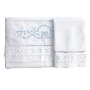 Esse jogo de lençol possui um lindo bordado inglês com laço azul, trazendo um toque delicado e discreto ao enxoval do seu bebê. Além disso, o ponto palito também é um detalhe charmoso que valoriza o produto.