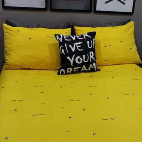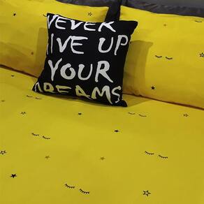 Kit composto por 4 peças. 1 lençol com elástico para cama de 1,88cmx1,38cm para colchões de até 40cm de altura - lençol cor amarelo sol com estampa Sonhos Designer 2 capas de travesseiros fronhas de 0,70cmx0,50cm - capas em cor amarelo sol com estampa Sonhos Designer 1 almofada exclusiva da grife de 45cm x 45cm com enchimento - preto com estampa em branco - estampa: never give up your dreams - nunca desista dos seu sonhos - almofada com enchimento.