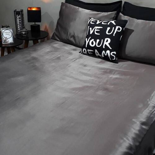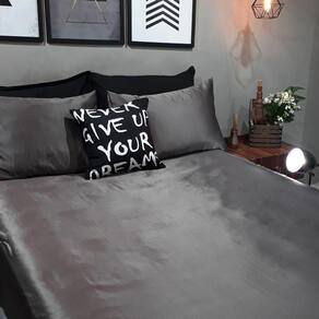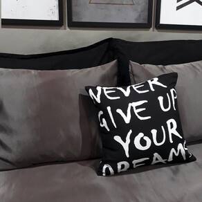 Kit composto por 4 peças. 1 lençol com elástico para cama de 1,98cmx1,86cm para colchões de até 40cm de altura - lençol em cetim cor grafite 2 capas de travesseiros ( fronhas ) de 0,70cmx0,50cm - capas em cetim cor grafite 1 almofada exclusiva da grife de 45cm x 45cm com enchimento - preto com estampa em branco - estampa: never give up your dreams - nunca desista dos seu sonhos - almofada com enchimento.