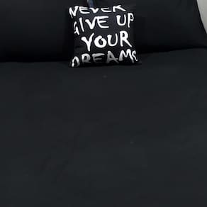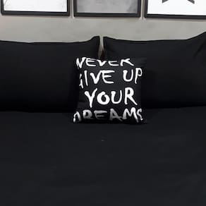 Kit composto por 4 peças. 1 lençol com elástico para cama de 1,98cmx1,86cm para colchões de até 40cm de altura - lençol cor preto 2 capas de travesseiros fronhas de 0,70cmx0,50cm - capas cor preto 1 almofada exclusiva da grife de 45cm x 45cm com enchimento - preto com estampa em branco - estampa: never give up your dreams - nunca desista dos seu sonhos - almofada com enchimento.