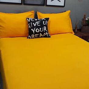 Kit composto por 4 peças. 1 lençol com elástico para cama de 2,03cmx1,98cm para colchões de até 40cm de altura - lençol cor amarelo 2 capas de travesseiros ( fronhas ) de 0,70cmx0,50cm - capas cor amarelo 1 almofada exclusiva da grife de 45cm x 45cm com enchimento - preto com estampa em branco - estampa: never give up your dreams - nunca desista dos seu sonhos - almofada com enchimento.