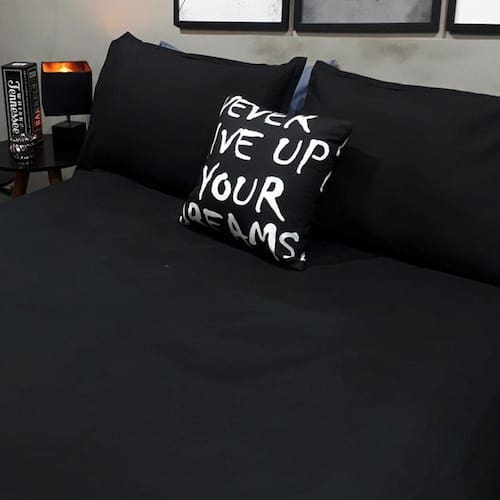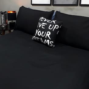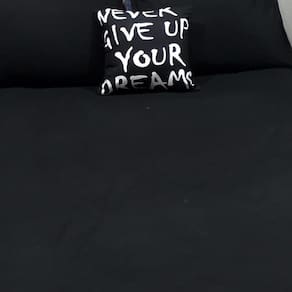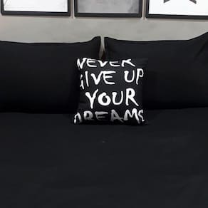 Lençol Com Elástico Solteiro 4 Un Preto Com Almofada DecorJogo de lençol para clientes que além do conforto, não abre mão de exclusividade e bom gosto também ao se deitar. Com designer rico, despojado e jovial, os jogos de lençóis da marca garantem um clima atemporal para o seu quarto. Pensados e ousados para valorizar o seu decor.Disponível para cama: solteiro comumKit composto por 4 peças.1 lençol com elástico para cama de 1,88cmx0,88cm para colchões de até 40cm de altura - lençol cor preto2 capas de travesseiros fronhas de 0,70cmx0,50cm - capas cor preto1 almofada exclusiva da grife de 45cm x 45cm com enchimento - preto com estampa em branco - estampa: never give up your dreams - nunca desista dos seu sonhos - almofada com enchimento. Detalhes:Lençol com elástico em toda extremidade barra para garantir um melhor ajuste no seu colchão sem ficar escapando e subindo ao se deitar. Elástico de alta qualidade para melhor pressão e facilidade ao vestir no seu colchão. Almofadas com zipper invisível para um acabamento delicado e de fácil lavagem. Acompanha enchimentoEm fibra siliconada revestida por polipropileno antialérgico. Capas de travesseiros não acompanham enchimento.Composição do produto:Lençol e capas de travesseiros em microfibra acetinada 180 fios. Tecido de toque macio e anti-pillingAlmofada em microfibra 180 fios fosco anti-pillingNossas peças são reconhecidas mundialmente pela qualidade e veracidade a qual vendemos pela internet. As almofadas a venda é composto por todas as peças da foto imagem, incluindo os enchimentos.Nossa estampa é 100% digital, podendo lavar por varias vezes sem perder a resolução da estampa e nem desbotar com o tempo.Atenção: o produto pode sofrer pequena alteração de tonalidade de cor dependendo da configuração do seu computador, tablet ou celular. Marca: Casa Da Fama