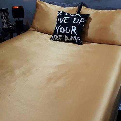 Kit composto por 2 peças. 1 lençol com elástico para cama de 1,88cmx0,88cm para colchões de até 30cm de altura - lençol em cetim dourado. 1 capas de travesseiros fronhas de 0,70cmx0,50cm - capa em cetim dourado.