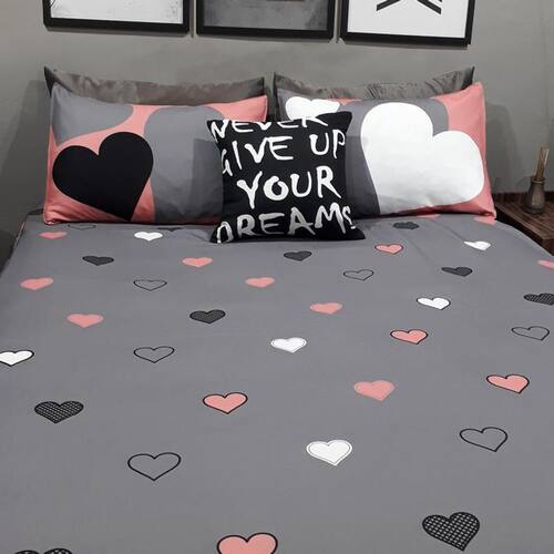 Kit composto por 4 peças. 1 lençol com elástico para cama de 2,03cmx0,96cm para colchões de até 40cm de altura - lençol cor cinza com estampa Love Designer 2 capas de travesseiros ( fronhas ) de 0,70cmx0,50cm - capas em cor cinza com estampa Love Designer 1 almofada exclusiva da grife de 45cm x 45cm com enchimento - preto com estampa em branco - estampa: never give up your dreams - nunca desista dos seu sonhos - almofada com enchimento.