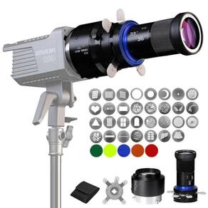 Perfeita para modelagem de luz em fotos ou vídeos artísticos, a Lente de Projeção Spotlight MG06 Max 33/36 Bowens para Iluminador LED atua como um concentrador de iluminação capaz de criar um nítido feixe de luz, com ou sem projeções gráficas. Desenvolvida com lente grande angular, foco ajustável e amplo ângulo de alcance, este Snoot de Projeção Spotlight é compatível com Refletores ou Iluminadores LED Bowens, sua lente de 33/36, juntamente com as Molduras Gráficas e Filtros de Gel inclusos permitem criar diferentes efeitos de luz e sombras, tornando-se perfeito para seções de fotografias, gravações criativas e transmissão em estúdio amador ou profissional.A lente de Projeção Spotlight MG06 Max é adequada para ambientes e estúdios de pequeno a médio porte, sua abertura fornece 2.3x mais transmissão de luz e pode ampliar a iluminação de maneira clara e nítida, oferecendo Projeções de até 1.2m de diâmetro em cerca de 2 metros de distância do plano, o que preserva os detalhes da forma escolhida. este snoot Óptico Modelador oferece 31 molduras gráficas com formas distintas, como formato de Lua, Coração, Janelas, Árvore, entre outros desenhos que ajudam a alcançar maior variedade de criações. Um pequeno Case de Armazenamento também está disponível para que você guarde as molduras.Para alterar a cor da iluminação e adicionar atmosfera artística, a Lente Spotlight MG06 Max acompanha também 5 filtros em gel nas cores Amarelo, Azul, Laranja, Verde e Vermelho, que podem ser anexados na parte frontal da lente através de um anel magnético que mantém o filtro fixado. Além disso, a engrenagem de ajuste manual presente na lente faz o controle de foco da projeção, permitindo que você controle facilmente a nitidez da forma escolhida e garantindo alta adaptação para diferentes cenários em fotos ou vídeos.Construído em liga de alumínio de alta qualidade, o Snoot Óptico Modelador possui estrutura leve e tamanho compacto. O design exclusivo e facilidade de uso do Difusor Óptico Spotlight MG06 Max possibilita que as Molduras Gráficas e Filtros de Gel possam ser juntos ou separados, tornando mais fácil a realização de diversos efeitos especiais de iluminação e sombras dinâmicas. além disso, o Snoot Óptico Spotlight MG06 Max adota Montagem Bowens como o encaixe principal para as luzes, que o torna amplamente compatível com a maioria das marcas de Iluminadores LED.Compatibilidade:iluminadores de LED com montagem Bowens.Para flashes de Estúdio recomendamos o modelo com lente específica, Spotlight MG06 Max Flash Mount.Principais Características: snoot Óptico Spotlight Profissional para modelagem de iluminação e criação de sombras Lente grande angular de 33, fornece abertura com 2.3x mais transmissão de luz Projeção com diâmetro de 1.2 metros em aproximadamente 2m de distância feixe de luz nítido e amplo, suporta projeção de diferentes formas com adição de cores Inclui 31 molduras gráficas e 5 filtros em gel para criação de atmosfera artística Anel de Corte magnético com 4 Abas, suporta efeitos como Cortes de Luz, Sobreposição de Molduras, etc. montagem Bowens, suporte com vidro óptico compatível com Iluminadores LED construído em liga de alumínio de alta qualidade, estrutura leve e tamanho compacto.Observações: A luz anexada a este modificador não pode ultrapassar a potência de 300W. Para LEDs acima de 500W recomenda-se o uso em baixa luminosidade ou inferior a 70% da potência. A interface Bowens deste modificador só pode ser anexada em encaixes com até 5cm de proeminência. Se o comprimento da base bowens exceder 5cm, o conector da lâmpada não poderá ser fixado. Não acompanha Tripé ou Iluminador LED. Imagens Ilustrativas.Obs.: Para Flashes de Estúdio recomendamos o modelo com lente específica, Spotlight MG06 Max Flash Mount.