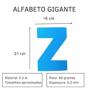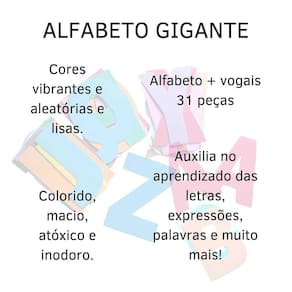 Letras gigante em eva alfabeto vogais grande 31 peças painel Alfabeto gigante + vogais 31 peças, aproximadamente 21 cm As letras gigantes de eva evamax, contêm todas as letras do alfabeto de a a z. Desenvolvidas para auxiliar no processo de alfabetização, formar palavras, frases, expressões, nomes e muito mais O eva evamax é colorido, macio, atóxico e inodoro. Indicado para maiores de 3 anos. Conteúdo da embalagem: 31 letras gigantes abc + vogais Medida da peça: 21 cm. Total de peças na embalagem: 31 peças. Espessura: 0,2 mm. Cor: , conforme fabricação. Marca: Não Informado