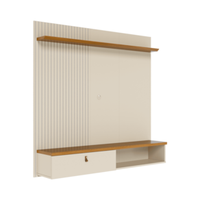 O Painel para TV Íris é a escolha ideal para deixar a sala mais moderna e organizada, com visual clean e instalação suspensa (fixado na parede). Ele conta com porta basculante para guardar controles e acessórios, além de prateleira superior para objetos decorativos. O destaque fica por conta do painel lateral em MDF frisado (baixo relevo) e do puxador com acabamento dourado fosco e detalhe que simula couro, que valorizam o ambiente.