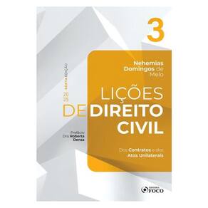 Sobre a obra Lições de Direito Civil - Volume 3 - 6ª Ed - 2025 Dos Contratos e dos Atos Unilaterais Esta obra aborda todos os conceitos indispensáveis ao conhecimento básico do direito civil brasileiro . A obra não tem a pretensão de ser um tratado doutrinário, mas como o próprio nome da coleção diz, ser lições de direito civil. Cada volume apresentado estabelece premissas fundamentais para a melhor compreensão da matéria ao analisar acertadamente os institutos que tratam do conteúdo da disciplina. Destacam-se na coleção alguns traços distintivos com relação a outras obras similares disponíveis no mercado, como, por exemplo, a falta de citação de outros autores. Quer dizer, a obra é direta e objetiva e o autor não se preocupou em ficar colacionando notas de doutrina de outros autores para reforçar seus conceitos. Outro exemplo: nas citações de artigos de Lei, especialmente do Código Civil , o leitor encontrará em notas de rodapé o texto do artigo mencionado. Dessa forma, o aluno não necessitará ter ao lado o vade mecum e ficar folheando-o em busca dos artigos mencionados. Quer dizer, seus conceitos são diretos, objetivos e claros, sem repetições. Lições de Direito Civil vai contribuir para a formação de futuros operadores do direito, bem como pode ser útil àqueles que vão prestar o Exame da Ordem dos Advogados do Brasil e aos candidatos que vão prestar concursos para juízes, promotores, defensores e outros cargos destinados a advogados. A coleção completa é composta dos seguintes volumes: Vol. 1 • Teoria Geral – das pessoas e dos bens – Prefácio Dra. Andrea Wild Vol. 2 • Obrigações e Responsabilidade Civil – Prefácio Dr. Paulo Hamilton Siqueira Jr Vol. 3 • Dos Contratos e dos Atos Unilaterais – Prefácio Dra. Roberta Densa Vol. 4 • Direitos das Coisas – Prefácio Dr. Carlos Alberto Garbi Vol. 5 • Família e Sucessões – Prefácio Dra. Adriana Galvão Moura Abílio Autor Nehemias Domingos de Melo APLICAÇÃO O livro destina-se especialmente aos alunos da graduação em direito, mas também pode ser adotado pelos cursinhos preparatórios para concursos públicos, bem como os preparatórios para o Exame da Ordem dos Advogados do Brasil .