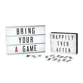 Luminária Led Lightbox Cinema A4 + 96 Letras e NúmerosColoque suas mensagens pessoais no centro das atenções com esta caixa de luz. São três painéis para inserir letras, ícones ou símbolos, permitindo que você coloque a frase que você quiser ou exiba seus ícones favoritos.Itens inclusos:Luminária Light Box96 slides letras, números e símbolos Cabo Usb.Voltagem 110/220 v Bivolt Tamanho:30cm x 22cm x 4cm A4Energia:Cabo Usb Incluso ou Pilha Aa Não inclusa