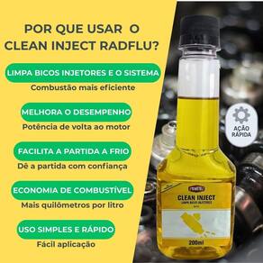Clean Inject Radflu 200ml O Clean Inject Radflu 200ml é um aditivo automotivo limpa bico injetor desenvolvido para a limpeza interna do sistema de alimentação de motores a gasolina, etanol ou flex. Sua fórmula atua diretamente no tanque, removendo resíduos e carbonização dos bicos injetores, válvulas e câmara de combustão, restaurando o desempenho do motor e proporcionando uma combustão mais eficiente. Ideal para quem busca economia de combustível, melhor partida a frio, redução de falhas e aumento da vida útil do motor, o Clean Inject Radflu é de fácil aplicação, bastando despejar o conteúdo no tanque com pelo menos 30 litros de combustível.