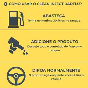 Ideal para quem busca economia de combustível, melhor partida a frio, redução de falhas e aumento da vida útil do motor, o Clean Inject Radflu é de fácil aplicação, bastando despejar o conteúdo no tanque com pelo menos 30 litros de combustível.