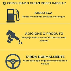 Clean Inject Radflu 200ml O Clean Inject Radflu 200ml é um aditivo automotivo limpa bico injetor desenvolvido para a limpeza interna do sistema de alimentação de motores a gasolina, etanol ou flex. Sua fórmula atua diretamente no tanque, removendo resíduos e carbonização dos bicos injetores, válvulas e câmara de combustão, restaurando o desempenho do motor e proporcionando uma combustão mais eficiente. Ideal para quem busca economia de combustível, melhor partida a frio, redução de falhas e aumento da vida útil do motor, o Clean Inject Radflu é de fácil aplicação, bastando despejar o conteúdo no tanque com pelo menos 30 litros de combustível.