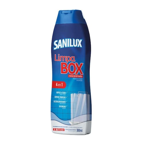 Limpa Box 300Ml Sanilux Bettanin Cuidado do Banheiro por completo. O Limpa Box Sanilux é um produto 4 em 1: Remove Manchas, Desengordurante, dá brilho e repele a água. Sua fórmula exclusiva mantém o box limpo dos vidros aos azulejos. O Limpa Box Sanilux vem com 300ml. Sanilux, mais brilho na limpeza.