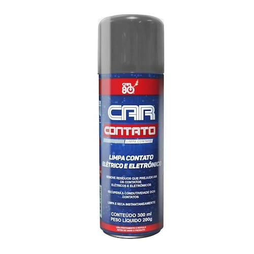 Limpa contatos car contato spray 300ml Car contato é um limpa contatos elétricos e eletrônicos desenvolvido para remover graxas, sujeiras, resíduos de umidade que causam oxidação e isolamento. Removendo também óleos e outros contaminantes das superfícies. Ajuda na prevenção de falhas e mau contato, sem alterar as propriedades elétricas. Na maioria dos casos, dispensa a desmontagem dos equipamentos. Características: Limpa contatos elétricos e eletrônicos; Remove resíduos que prejudicam os contatos elétricos e eletrônicos; Recupera a condutividade dos contatos; Limpa e seca instantaneamente.