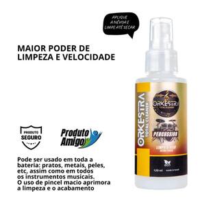 Limpa seco percussão total cleaner percussion 120ml orkestra -descrição do produto: Formulado para sujidades intensas. Use em pratos, peles, ferragens, na bateria inteira o primeiro limpador a seco ecológico para instrumentos musicais e equipamentos. Solução 100%. Não mancha e não desbota. Único 6x1 do mercado - limpa, desengordura, age em oxidações, ferrugens e odores, higieniza e dá brilho em operação instantânea e simultânea. Seguro também em verniz nitrocelulose e outras pinturas. Conceito: aplique a névoa e limpe até secar. Aplique e movimente até que a sujidade vá soltando com pincel, esponja ou escova macios facilitando a renovação. Use de delicadeza sobre as marcas. Produto a base d'água água é melhor limpador do planeta . Pode ser aplicado em quaisquer materiais. Produto seguro. Altíssimo rendimento. Altíssimo rendimento. Modo de usar Passo 1: pulverize a névoa sobre a superfície de todo o instrumento ou equipamento uniformemente sem escorrer. uso de pincel macio ou esponja em detalhes, cantos e rebaixos aprimora a limpeza . Passo 2: use dois panos: o primeiro pano limpando e removendo a sujidade; o segundo pano seco para acabamento, higienizando e gerando acabamento com brilho intenso. Aprendendo Na pele da bateria, aplique e aguarde um tempo até que umedeça a sujidade. Use pincel e esponja. Reaplique se necessário. Em pratos e suportes metálicos c7romados ou não, aplique a névoa até que superfície fique umida. Use pincel ou esponja para movimentar sujidades, após pano. Pode-se aplicar sobre as marcas, contudo seja sempre suave e cuidadoso. Distinga manchas de sujidades. Pode ser no corpo do instrumento, em escalas, cordas, captadores, cromados, prata etc. Limpe cordas sem necessidade em removê-las. Por debaixo delas, use pano com palheta sem cantos para não riscar. Recupera o grip e mantém limpas por mais tempo. A névoa já realiza todas as funcionalidades Pode ser aplicado em verniz nitrocelulose, e internamente em instrumentos de sopro. Instrumentos encerados: aplique e limpe com rapidez Em mecanismos: se limpos integralmente, lubrifique novamente. Oxidação e ferrugens se removem com orkestra; em ferrugem talvez seja necessário palha de aço fina. Equipamentos diversos: em mesas de som, equipamentos, telas lcd, luzes e refletores, suportes, móveis etc. Sobre nossa loja: Somos a e musical loja de instrumentos e acessórios musicais. Contamos com uma vasta gama de produtos novos e seminovos revisados, uma equipe de vendas especializada que trabalha desde 2009 no mercado da música. Estamos sempre à disposição para atender suas necessidades e exigências como músico Lojaemusical Jacareí sp