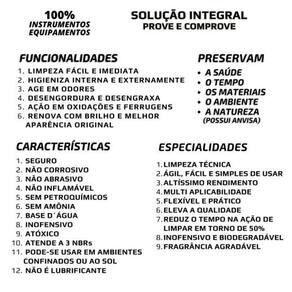 O primeiro limpador a seco ecológico para instrumentos musicais e equipamentos. Solução 100%. Único 6x1 do mercado - limpa, desengordura, age em oxidações e odores, higieniza e dá brilho em operação instantânea e simultânea. Use também em verniz nitrocelulose. Tem ação sobre oxidação e ferrugem. Conceito: aplique a névoa e limpe até secar. Use pincel, esponja ou escova macios se desejar. Produto a base d'água água é melhor limpador do planeta . Pode ser aplicado em quaisquer materiais. Produto seguro.