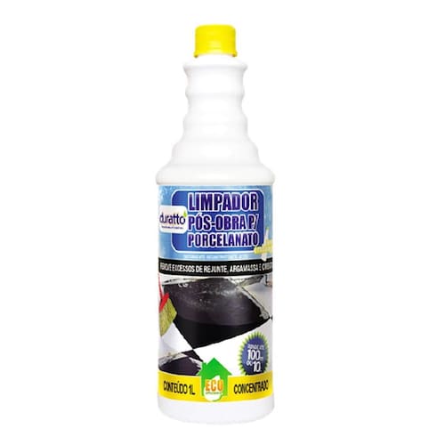 Limpador Concentrado Pós Obra Para Porcelanato 1L Duratto Aplicações: - produto para limpeza pós-obra de porcelanatos; - limpa e remove excesso de rejuntes inclusive de base epóxi ; - remove resíduos de cimento, argamassa, gesso e etc; - remove marcas de ferrugem e resíduos impregnados. - aguardar 72 horas após o rejuntamento para utilização deste produto. Rende até 100m / litro Produto concentrado Indicação de uso Usar em porcelanato polido, esmaltado, rústico, gloss e hd. Modo de usar 1- diluir o produto conforme tabela abaixo; 2- espalhar sobre a superfície com o auxílio de uma vassoura; 3- deixar agir por 5 a 10 minutos; 4- esfregar utilizar uma vassoura tipo piaçava, escova ou outro material similiar ; 5- enxaguar para remoção dos resíduos. Repetir a operação caso não remova completamente os resíduos. Ean: 7896614806885