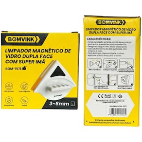 Limpador Magnético de Vidro Dupla Face com Super Ímã BOM-1571 - Bomvink O limpador magnético de vidro dupla face BOM-1571 da Bomvink foi desenvolvido para facilitar a limpeza de janelas de vidro com segurança, eficiência e praticidade. Equipado com um sistema de ímãs de alta potência, o produto permite a higienização simultânea das duas faces do vidro, eliminando a necessidade de acesso externo ou movimentos arriscados, especialmente em janelas de difícil alcance, como em andares altos. Este modelo possui estrutura leve, porém resistente, fabricada em plástico ABS de alta durabilidade. O seu sistema magnético interno é composto por super ímãs de neodímio, que oferecem força de atração constante e eficaz, mantendo as duas partes do limpador perfeitamente alinhadas durante todo o processo de limpeza. Ele é indicado para vidros com espessura entre 3 mm e 8 mm, sendo ideal para janelas residenciais, vitrines, portas de vidro e divisórias. O BOM-1571 conta com esponjas e tiras de borracha integradas que promovem uma limpeza completa em duas etapas: lavagem e secagem. A esponja remove sujeiras, poeiras e manchas, enquanto as lâminas de borracha proporcionam o acabamento final sem deixar marcas ou resíduos. O produto acompanha uma corda de segurança que deve ser fixada ao pulso ou estrutura próxima, evitando quedas acidentais em caso de desencaixe da parte externa. Seu manuseio é simples: basta posicionar cada metade do limpador em lados opostos do vidro e movimentá-lo de forma contínua. O alinhamento magnético garante que ambos os lados se movimentem juntos, promovendo uma limpeza uniforme e eficaz com o mínimo de esforço.