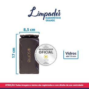 Especificações: Marca: Soma Modelo: Magscrap-15 Tamanho: grande Revendedor oficial: Mega Aquários Produto: Limpador magnético Para vidros de 10 a 15mm de espessura Composição: plástico, tecido sintético e imã magnético Tamanho: 8,5 x 17 x 3cm Peso: 270g
