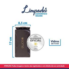 Especificações: Marca: Soma Modelo: Magscrap-15 Tamanho: grande Revendedor oficial: Mega Aquários Produto: Limpador magnético Para vidros de 10 a 15mm de espessura Composição: plástico, tecido sintético e imã magnético Tamanho: 8,5 x 17 x 3cm Peso: 270g