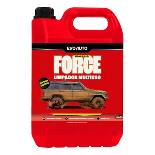 Force detergente multifunção evo auto - 5 litros O force evo auto é um apc all purpose cleaner super concentrado e versátil, ideal para limpezas leves, médias e pesadas. Sua fórmula exclusiva age contra sujidades orgânicas e minerais, combinando propriedades de shampoos ácidos, alcalinos e neutros, garantindo limpeza eficiente sem agredir as superfícies. Principais benefícios Fórmula poderosa Remove sujeiras leves, médias e pesadas com eficiência. Versatilidade Atua em resíduos orgânicos e minerais. Seguro para superfícies Não danifica pinturas ou materiais sensíveis. Alta diluição Concentração que garante economia e alto rendimento. Indicado para veículos, máquinas agrícolas, chassis e rodas A nr estetica oferece uma de 7 dias uteis