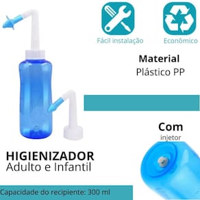 Descrição do anúncio: Conteúdo da embalagem: 1 higienizador nasal com recipiente de 300 ml 1 bico nasal tamanho adulto 1 bico nasal tamanho infantil Características: Alívio de sintomas como nariz entupido, dores de cabeça, espirros e coriza Facilita a remoção de impurezas e bactérias Hidratante para dias de tempo seco Diminui crises de asma, bronquite e outras alergias Previne amidalite e faringite Combate à otite Reduz dores de cabeça e mal-estar causados pela obstrução nasal Procedimento seguro e recomendado por médicos Especificações: Material: plástico pp Capacidade do recipiente: 300 ml Peso: aprox. 115g Livre de bpa: sim Principais perguntas sobre o produto e respostas: 1 qual a capacidade do recipiente A capacidade do recipiente é de 300 ml. 2 pode ser por crianças e adultos Sim, o higienizador nasal é adequado e eficiente tanto para crianças quanto para adultos. 3 qual é o material do produto O produto é feito de plástico pp e é livre de bpa. 4 como é feito o procedimento de lavagem O procedimento é indicado com soro fisiológico ou água morna com sal, escolhendo a ponteira adequada, inclinando a cabeça e apertando o botão para iniciar a lavagem. 5 o produto vem com Sim, o produto possui do vendedor de 30 dias. 6 é necessário virar a cabeça para o lado durante a lavagem Não, não é necessário virar a cabeça para o lado, evitando possíveis dores no ouvido.