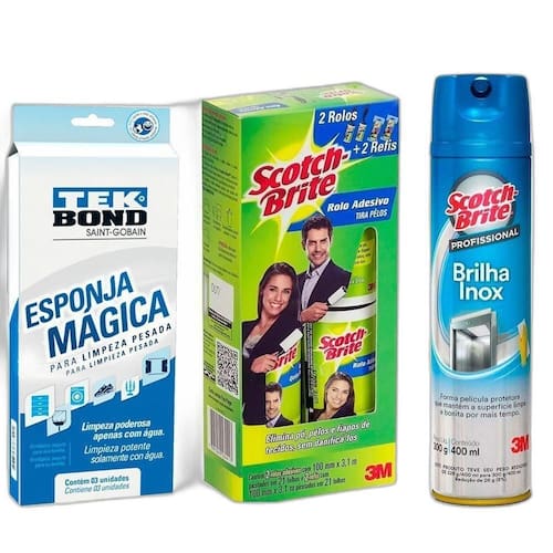 O kit limpeza profissional é o conjunto perfeito para quem busca eficiência e praticidade na hora de limpar e dar brilho a superfícies em casa ou no escritório. Composto por três produtos de alta qualidade: o brilha inox scotch brite, a esponja mágica tekbond e o rolo adesivo scotch brite, este kit é ideal para quem deseja ter um ambiente sempre limpo e brilhante. O brilha inox scotch brite é indicado para limpar e dar brilho a superfícies de aço inox, cromado, alumínio, objetos esmaltados, peças de cerâmica, madeira envernizadas e muito mais. Além de remover sujeiras, ele deixa uma camada protetora na superfície, evitando a oxidação e facilitando a limpeza em futuras ocasiões. Com uma ação rápida e sem deixar resíduos gordurosos, este produto é eficiente e fácil de usar. A esponja mágica tekbond é perfeita para a remoção de manchas, riscos e sujeiras em diversos materiais, como paredes, espelhos, cerâmicas, vidros, mesas de madeira, pisos e muito mais. Feita com plástico expandido a base de melamina, ela limpa com facilidade apenas com água e sem agredir o meio ambiente. É uma esponja ecológica e eficiente, capaz de remover sujeiras e impurezas com pouco esforço. Por fim, o rolo adesivo scotch brite é perfeito para manter suas roupas e tecidos livres de pó, pelos, cabelos e fiapos. Com fita adesiva de alta performance e cabo que pode ser com refil, este rolo garante fácil uso e melhor aparência para suas roupas antes de sair de casa. Pode ser em calças, casacos, blusas, vestidos, ternos, sofás, cortinas, roupas de cama e muito mais. Com maior poder de remoção e ponta de adesivo fácil de achar, o rolo adesivo scotch brite é uma opção eficiente e prática. Com três produtos de alta qualidade em um só pacote, este kit é a escolha certa para quem deseja um ambiente sempre limpo As imagens são meramente ilustrativas