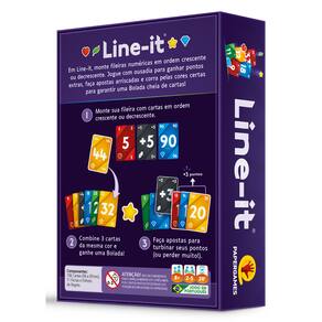 Em Line-it suas decisões valem ouro! Crie fileiras numéricas crescentes ou decrescentes, escolhendo entre garantir pontos imediatamente ou arriscar tudo para conquistar uma grande bolada! A cada rodada, tensão e diversão se encontram enquanto você equilibra risco e recompensa. Em Line-it, cada carta importa. Forme sequências com estratégia, use suas cartas de aposta para aumentar seus pontos e fique atento ao mercado. Observe o jogo dos adversários e aproveite o momento certo para pegar uma bolada, aumentando ainda mais sua pontuação. Fácil de aprender e dinâmico, Line-it é ideal para jogadores de todas as idades e níveis de experiência. Seja entre amigos ou em família, cada partida garante novas estratégias e reviravoltas surpreendentes. Você vai arriscar mais por uma grande recompensa ou garantir pontos seguros para vencer? 2-5 Jogadores | 20 min. | Idade: 8+ Conteúdo – 106 Cartas (56 x 87 mm)– 11 Fichas– Folheto de Regras
