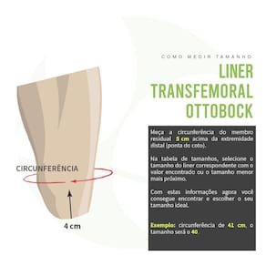 Aplicação e Modo de Usar: Medidas para a escolha de qual o tamanho ideal do liner, é indicado medir a circunferência do coto. Como medir: Com uma fita métrica, meça da ponta distal do coto até uma altura de 5cm, marcando com uma caneta o ponto correto para a circunferência. Após a marcação de 5cm, envolver o coto com a fita métrica, medindo assim a circunferência do mesmo. Com o valor em milímetros (mm) da circunferência do coto, verifique os valores de tamanhos do liner e escolha o que apresente um valor abaixo da medida realizada anteriormente. Exemplo de como medir circunferência do coto para escolha de tamanho do liner. Tamanhos disponíveis para o 6Y81: 280, 300, 320, 340, 360, 380, 400, 420, 450, 500, 550mm.