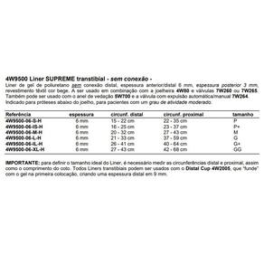 Detalhe Técnico: Liner de poliuretano sem conexão distal, espessura anterior/distal 6 mm, espessura posterior 3 mm, revestimento têxtil cor bege. A ser utilizado em combinação com a joelheira 4W80 e válvulas 7W260 ou 7W265. Também pode ser utilizado com o anel de vedação 5W700 e a válvula com expulsão automática/manual 7W264. Indicado para próteses abaixo do joelho, para pacientes com um grau de atividade moderado. P - Circunferência Distal = 15 a 22cm - Circunferência Proximal 22 a 35cm, P+ - Circunferência Distal = 16 a 25 cm - Circunferência Proximal 23 a 37cm, M - Circunferência Distal = 20 a 32 cm - Circunferência Proximal 27 a 43cm, G - Circunferência Distal = 21 a 33 cm - Circunferência Proximal 37 a 59cm, G+ - Circunferência Distal = 26 a 41 cm - Circunferência Proximal 40 a 64cm, GG - Circunferência Distal = 27 a 43 cm - Circunferência Proximal 42 a 68cm. IMPORTANTE: para definir o tamanho ideal do Liner, é necessário medir as circunferências distal e proximal, assim como o comprimento do coto. Todos Liners transtibiais podem ser utilizados com o Distal Cup 4W2005, que “funde” com o material na primeira colocação, criando uma espessura distal em 9 mm.