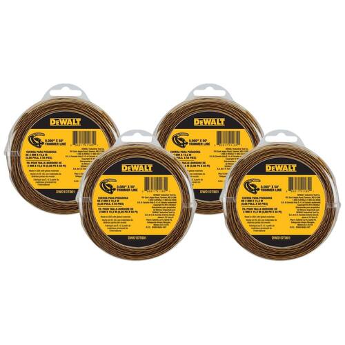Linha de corte de cordas DEWALT DWO1DT801, 50 pés por 0,080 polegadas (pacote com 4) - As informações abaixo são apenas por pacote - 50 pés de comprimento x 0,080 polegadas de largura - Construída com materiais flexíveis e resistentes a impactos - Design aerodinâmico