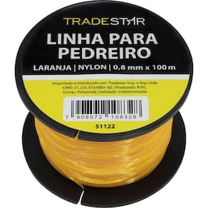 51122 - Linha p/ pedreiro nylon laranja 100 m - monofilamento sintético, sendo poliamida (nylon), de título decitex 5730, espessura 0,8 mm, comprimento 100 m, cor laranja, acondicionada em rolos. Indicada para uso na construção civil, como guia e auxiliar na marcação e alinhamento para assentar tijolos, blocos e pisos, denominada comercialmente linha para pedreiro. Marca Tradestar