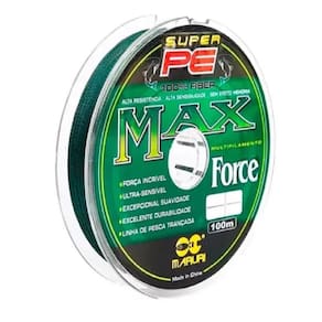 Ançadas 100% PE, deixando assim com um acabamento mais arredondadoImpermeabilizada baixa absorção de água , desliza facilmente pelos passadores proporcionando arremessos mais longos e precisos.Tecnologia avançada de revestimento, resistente à abrasão, mais forte e resistente à água salgada, resultando em maior durabilidade.Características Gerais:- Linha de multifilamento trançada em 4 fios de 100% polietileno;- Alta sensibilidade: permite ao pescador uma reação mais rápida às fisgadas do peixe;- Elasticidade zero: reduz o risco com as garatéias por não provocar chicoteada;- Eficiência garantida: uso amador e ;- Mais força, maciez e resistência que as linhas tradicionais;- Revestida com repelente à água: baixa absorção de água;- Não danifica os passadores;- Desenvolvida na cor verde escuro;- Excelente resistência;- Fácil manuseio;- Sem efeito memória;Especificações Técnicas:- Cor: Verde- Marca: Maruri Fishing- Modelo: Max Force 4X- Espessura: 0.24mm- Resistência: 26Lb 11.8kg - Comprimento: 100m Marca: Não Informado