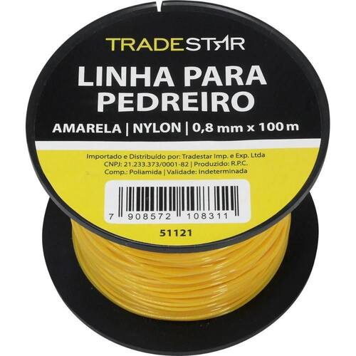 Principais Características do Produto 0 (bullet_point#0): Fabricado em material de alta qualidade e resistência | Principais Características do Produto 1 (bullet_point#1): Ideal para e doméstico | Principais Características do Produto 2 (bullet_point#2): Proporciona maior durabilidade e eficiência no trabalho | Baterias são necessárias? (batteries_required): Não | external_testing_certification:: CE | included_components: Linha Pedreiro Nylon 0,8 mm 100 Metros Amarela Tradestar | manufacturer: Tradestar | number_of_items: | power_source_type: Manual | required_product_compliance_certificate: CE | unit_count: 1 | number_of_boxes: 1 | material : | model_number: | item_length_width_height: | part_number: | deprecated_offering_start_date : | is_expiration_dated_product: | warranty_description: | item_dimensions: | color: