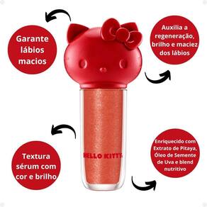 Lip Oil Hello Kitty Óleo labial com cor e brilho multidimensional. Com textura sérum e fórmula enriquecida com um blend nutritivo, Extrato de Pitaya e Óleo de Semente de Uva. O Lip Oil possui ação umectante e é rico em moléculas que auxiliam a regeneração, brilho e maciez dos lábios. Bruna Tavares + Hello Kitty Lip Oil possui uma embalagem com design exclusivo, trazendo o molde da tampa personalizado com o rosto da Hello Kitty em relevo e em vermelho, uma das cores da personagem. Não testado em animais. Oftalmologicamente testado. Dermatologicamente testado. - Textura sérum - Cor e brilho - Garante lábios macios - Enriquecido com Extrato de Pitaya, Óleo de Semente de Uva e blend nutritivo - Pode ser sozinho ou por cima do batom . Modo de Uso Aplique o produto nos lábios deslizando o aplicador do centro para as laterais. Utilize-o individualmente ou sobre o batom escolhido, a fim de conferir mais brilho e conforto para os lábios. . Sua fórmula nutritiva ajuda a garantir lábios macios e com brilho natural. O Lip Oil Hello Kitty pode ser sozinho ou apenas como um gloss Sim O Lip Oil pode ser sozinho para um acabamento natural, hidratante e com brilho multidimensional, ou por cima de um batom para dar mais brilho e conforto aos lábios. Quais são os principais ingredientes do Lip Oil Hello Kitty O Lip Oil Hello Kitty é enriquecido com Extrato de Pitaya e Óleo de Semente de Uva, ambos conhecidos por suas propriedades hidratantes e regeneradoras, além de um blend nutritivo que ajuda a manter os lábios macios e brilhantes. . Código de Registro Sanitário ANVISA 25351.395440/2024-61 Marca: Não Informado