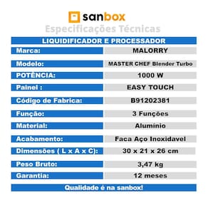 O Liquidificador 2 em 1 MASTER CHEF Blender Turbo 1000W 127V-Mallory oferece um desempenho incrível com muita potência e fidelidade, pelo melhor custo benefício. Além disso, aproveitando 100% de seus alimentos.