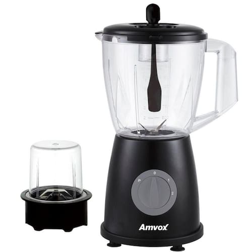 Liquidificador Amvox ALQ 600 com 600W de potência, capacidade de 1,8 L, super lâmina para triturar diversos alimentos, copo Inverse para economizar espaço e hélice removível para fácil limpeza.