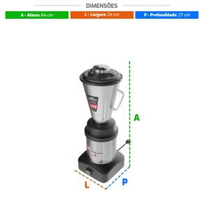 O copo tem capacidade máxima de 2 litros, sendo do tipo monobloco e fabricado em aço inoxidável.
