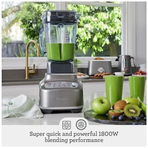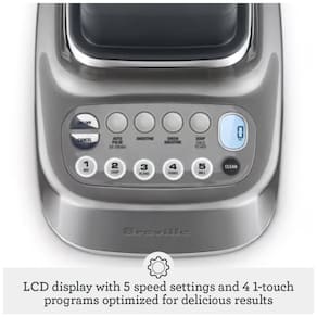 O Breville Q é um liquidificador de qualidade comercial perfeito para a cozinha doméstica. Com uma velocidade da ponta da lâmina de 186 mph (aproximadamente 299 km/h), possui 4 programas com um toque e 5 configurações de velocidade para oferecer uma otimização avançada da textura para texturas suaves e macias.