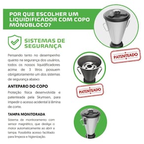 Características Técnicas: Potência 0,5CV Consumo 0,67 kWh Copo monobloco sem soldas Fácil Limpeza Gabinete e copo em aço inox escovado Fácil limpeza Perfeita vedação na tampa Sistema de encaixe sextavado do eixo Rotação de 3500 rpm Copos intercambiáveis Tampa de borracha atóxica com dosador Eixo e acoplamento metálicos
