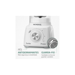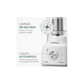 Especificações: Velocidades 3 velocidades Capacidade 2,2 litros Material do Copo Polipropileno Função pulsar Sim Função autolimpeza Sim Função quebra gelo Sim Quantidade de lâminas 4 lâminas Tipo de lâminas Lisas Material das lâminas aço inox Tampa dosadora Sim Trava de segurança Sim Porta-fio Sim Base antiderrapante Sim Filtro Sim Potência 500W / 220V Consumo 0,5 kW/h Frequência 60 Hz Altura 34 cm Largura 24,5 cm Profundidade 19 cm Peso 2,3 kg