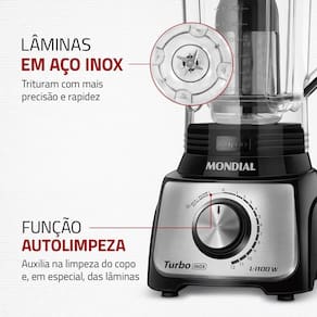 Com 1.100W de potência e capacidade total de 3 litros, o liquidificador Mondial Turbo L-1100 é perfeito para a sua família! Ele oferece vantagens na preparação de grandes porções: são 12 velocidades, 4 lâminas em inox, sendo 2 lisas e 2 serrilhadas, além da função Autolimpeza. Você pode preparar bolo de cenoura, pão de queijo, pizza de liquidificador e outras receitas em ‘tamanho família’. Saiba tudo sobre o L-1100-BI: