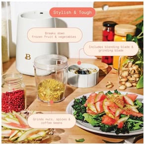 Liquidificador pessoal compacto de 240W da linha Beautiful by Drew Barrymore, com acabamento branco fosco e sistema de copos para preparo direto e consumo imediato de bebidas e receitas em pequenas porções. Utiliza conjunto de lâminas em aço inox para mistura e trituração, indicado para smoothies individuais, pequenos molhos, preparo de alimentos em porções reduzidas e moagem de café e temperos secos.