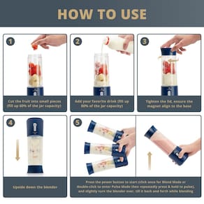 - ? Liquidificador portátil – Nosso liquidificador sem fio é projetado com um cordão antiderrapante e uma capa à prova de vazamento para que você possa levar sua bebida para qualquer lugar e a qualquer momento. Você não precisa derramar em outra garrafa e depois beber diretamente. Para limpar, basta colocar um pouco de água e sabão no copo, pressionar o botão para entrar no modo "autolimpeza" e depois enxaguar sob a torneira. Ideal para cozinha, escritório, academia, atividades ao ar livre, viagens, acampamento, pesca, etc.