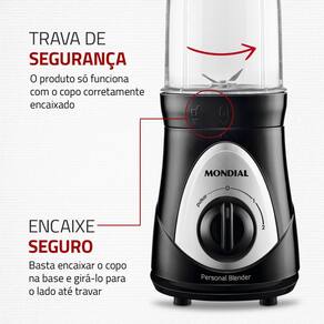Leve suas bebidas para onde quiser! Com o Personal Blender da Mondial, acompanha 2 copos de 750mL cada, assim você prepara sucos, vitaminas, shakes e coquetéis e pode carregar para academia, escritório ou qualquer outro lugar. Os 300W de potência, lâminas em aço inox e 2 velocidades + pulsar, proporcionam um excelente desempenho no preparo das bebidas. Aproveite a qualidade que a Mondial oferece!